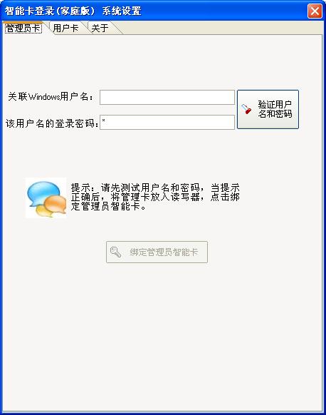 設置好所有的時間后,請輸入與該用戶卡關聯(lián)的計算機用戶名和密碼,此用戶名可以是任何用戶或者是受限制的用戶,一旦驗證成功后,將智能卡放置與登錄器,點擊綁定用戶智能卡,系統(tǒng)將提示成功信息。