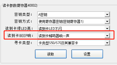 選擇蜂鳴器響一聲,如果僅僅讀取卡號,則每次讀到卡號后,蜂鳴器會響一聲, 如果選擇自動讀取數(shù)據(jù),則讀取數(shù)據(jù)成功后響一聲。