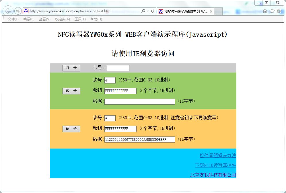 ? 基于ActiveX技術(shù)的ocx控件是實現(xiàn)網(wǎng)頁上讀寫IC卡的一個比較不錯的方法,因為ocx是com組件,通過其發(fā)布的接口,IE可以實現(xiàn)所有的功能。ActiveX不僅能適應(yīng)大部分編程語言,做到與編程語言無關(guān),還能將IC卡讀卡器集成到web中,使得在BS結(jié)構(gòu)中可以在web客戶端輕松的調(diào)用IC卡讀卡器,極大地改善了用戶體驗。 ? 只要為IC卡讀卡器或者NFC讀寫器發(fā)布相應(yīng)的ActiveX控件就可以實現(xiàn)在WEB客戶端使用IC卡讀卡器了,為此友我科技發(fā)布了yw60x.ocx這個IC卡讀卡器控件,并且分為了32位和64位版本,分別對應(yīng)32位IE和64位的IE??丶w60x.ocx支持的讀卡器有SDT-HA,YW-605HA,YW-607等。但是這種技術(shù)方案的最大缺點就是只支持IE瀏覽器,不支持其他的瀏覽器。