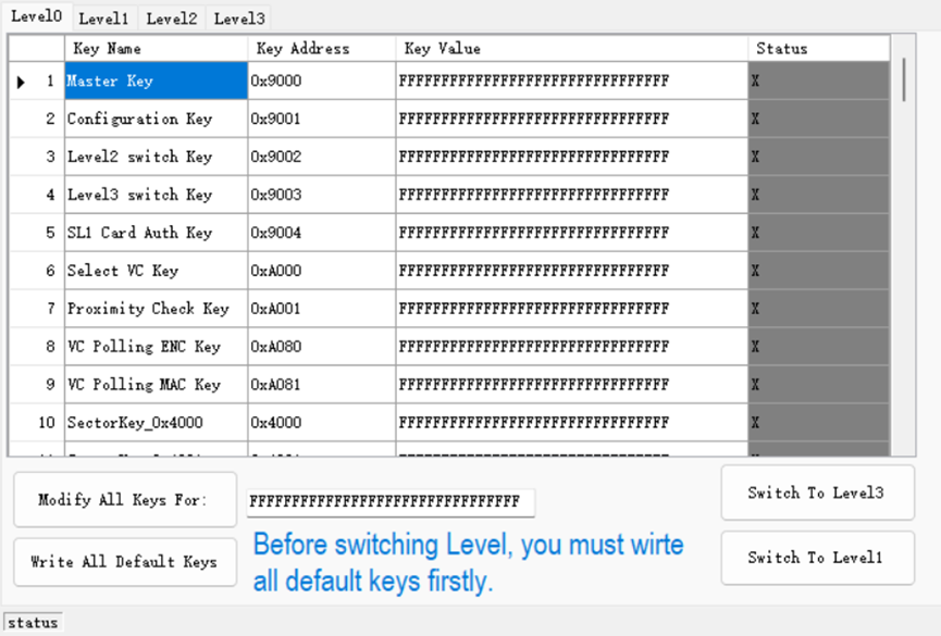 Switch TO Level1: 將卡片切換到LEVEL1, 在執(zhí)行該功能前,需先寫入默認(rèn)密鑰