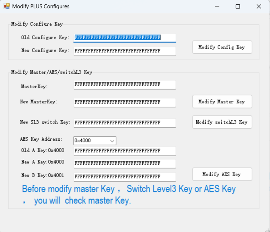 主要用于修改各個密鑰塊,主要包括Master Key, configuration Key,Level3 switch key, 各個扇區(qū)的AES key,操作界面如下圖:
