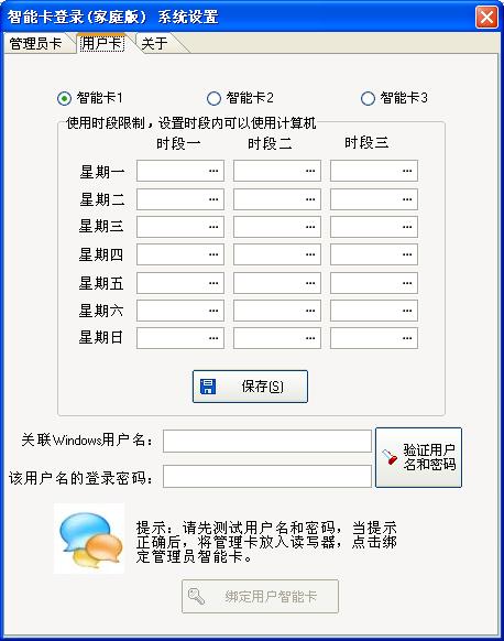 設(shè)置好所有的時(shí)間后,請(qǐng)輸入與該用戶(hù)卡關(guān)聯(lián)的計(jì)算機(jī)用戶(hù)名和密碼,此用戶(hù)名可以是任何用戶(hù)或者是受限制的用戶(hù),一旦驗(yàn)證成功后,將智能卡放置與登錄器,點(diǎn)擊綁定用戶(hù)智能卡,系統(tǒng)將提示成功信息。
