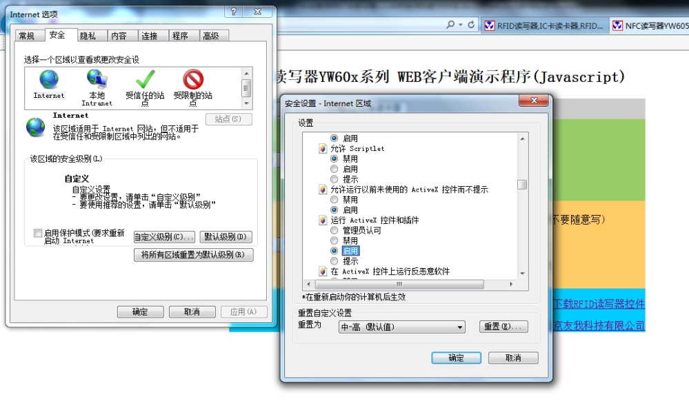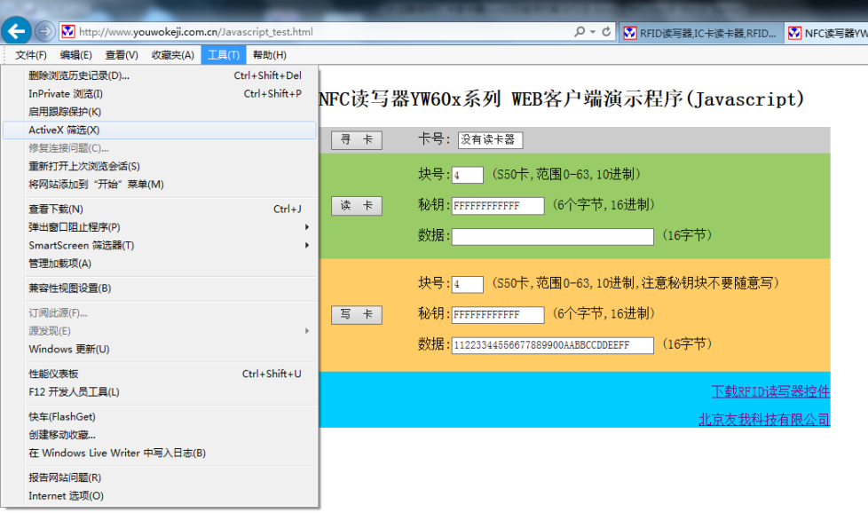? ? 在瀏覽器調(diào)用友我科技IC卡讀卡器ocx可能出現(xiàn)各種錯誤或者提示,一般這種提示或者錯誤都是設(shè)置項不合適造成的,通過調(diào)整設(shè)置項一般都能解決。本文將針對IE瀏覽器的各種提示和錯誤提出各種應(yīng)對的解決方法。